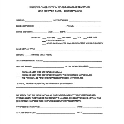 The goal of the OMTA Composition Festival is to inspire young composers by providing a forum for creativity and self-expression. Learning how to compose music opens up avenues for creativity and self-expression. In addition, that knowledge increases students’ understanding of the structure and character of the pieces they are practicing. Students submit their compositions to be critiqued by the adjudicator prior to their District Festival. Compositions must be scored by the student not the teacher, either by hand at the district level, or in computer notation at the state level. Compositions are evaluated on notation, form, timbre and style. All district participants receive a certificate of Participation and a written evaluation of their own composition from the adjudicator.